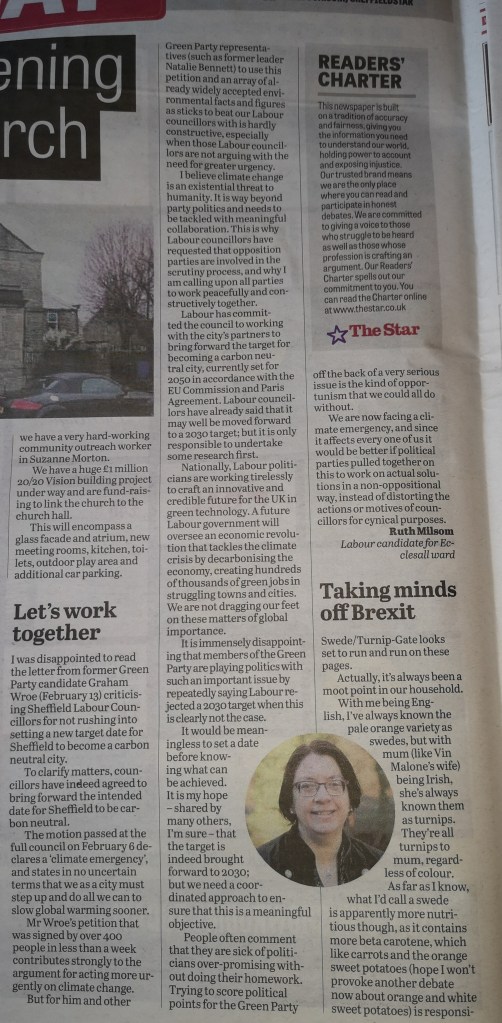 I am very pleased that Labour Candidate Ruth Milsom understands the urgency of climate change and wants the Council to commit to becoming zero carbon by 2030. (letters 9.3.19) I hope she can persuade her colleagues in the Cabinet to make this a reality. I am also pleased that she wants to work with others to make this a success. I am sure Sheffield Council will have the full cooperation of all the various green groups to help them meet their targets if the Council choose to cooperate with them.