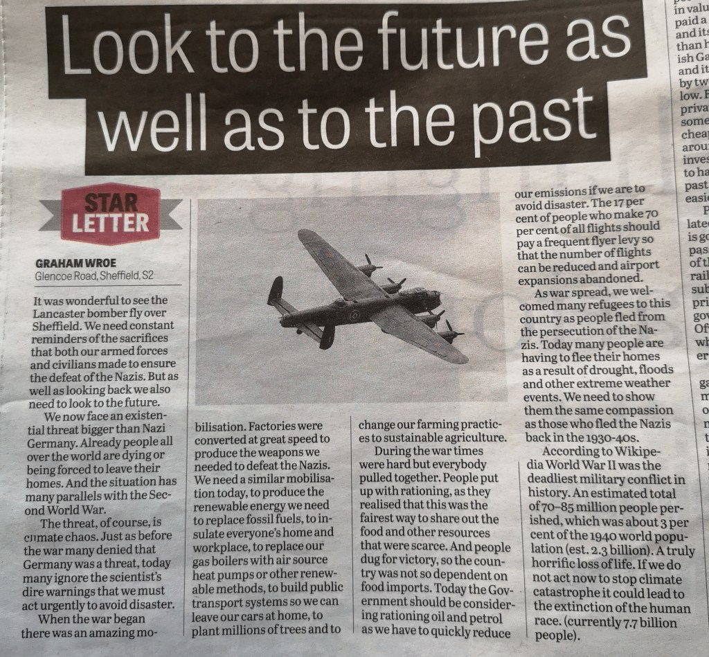 It was wonderful to see the Lancaster bomber fly over Sheffield. We need constant reminders of the sacrifices that both our armed forces and civilians made to ensure the defeat of the Nazis. But as well as looking back we also need to look to the future.