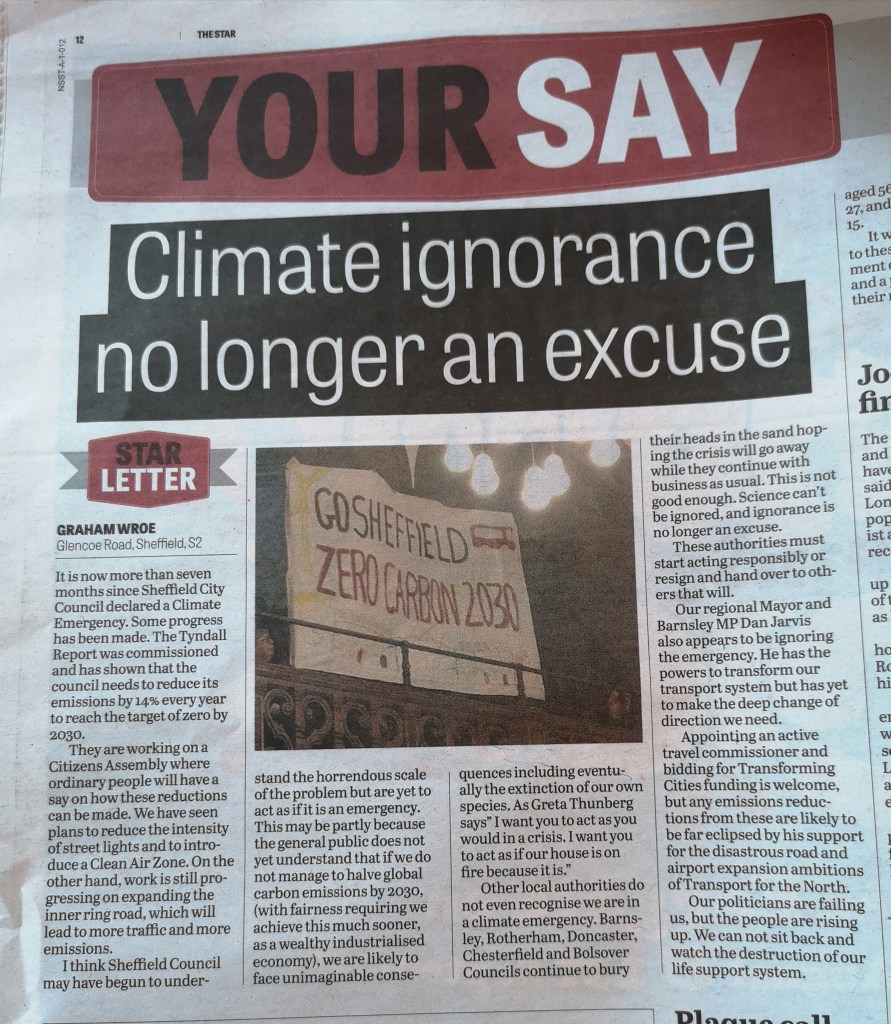 It is now more than 7 months since Sheffield City Council declared a Climate Emergency. Some progress has been made. The Tyndall Report was commissioned and has shown that the Council need to reduce its emissions by 14% every year to reach the target of zero by 2030. They are working on a Citizens Assembly where ordinary people will have a say on how these reductions can be made. We have seen plans to reduce the intensity of street lights and to introduce a Clean Air Zone. On the other hand, work is still progressing on expanding the inner ring road, which will lead to more traffic and more emissions. I think Sheffield Council may have begun to understand the horrendous scale of the problem but are yet to act as if it is an emergency. This may be partly because the general public does not yet understand that if we do not manage to halve global carbon emissions by 2030 (with fairness requiring we achieve this much sooner, as a wealthy industrialised economy), we are likely to face unimaginable consequences including eventually the extinction of our own species. As Greta Thunberg says” I want you to act as you would in a crisis. I want you to act as if our house is on fire because it is.”