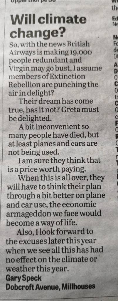 It is a shame that Gary Speck of Millhouses does not recognise that Extinction Rebellion supporters may also currently be mourning the loss of loved ones, be risking their lives in front line jobs or wondering if they will still have a job when the lockdown is over. He seems to have forgotten the first rule of the pandemic- be kind. I certainly won’t be punching the air in delight at other people’s misfortune.