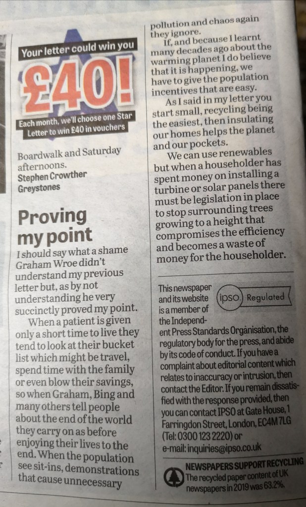 The major changes I can think of in my lifetime have been the result of organised protest by the people. The end of the poll tax, the end of Apartheid, the fall of the Berlin wall, and locally the closure of the old Bernard Road incinerator and the end of the destruction of our street trees. So while-ever the Government continues to ignore the urgency of the climate and ecological emergencies, I will continue to protest.