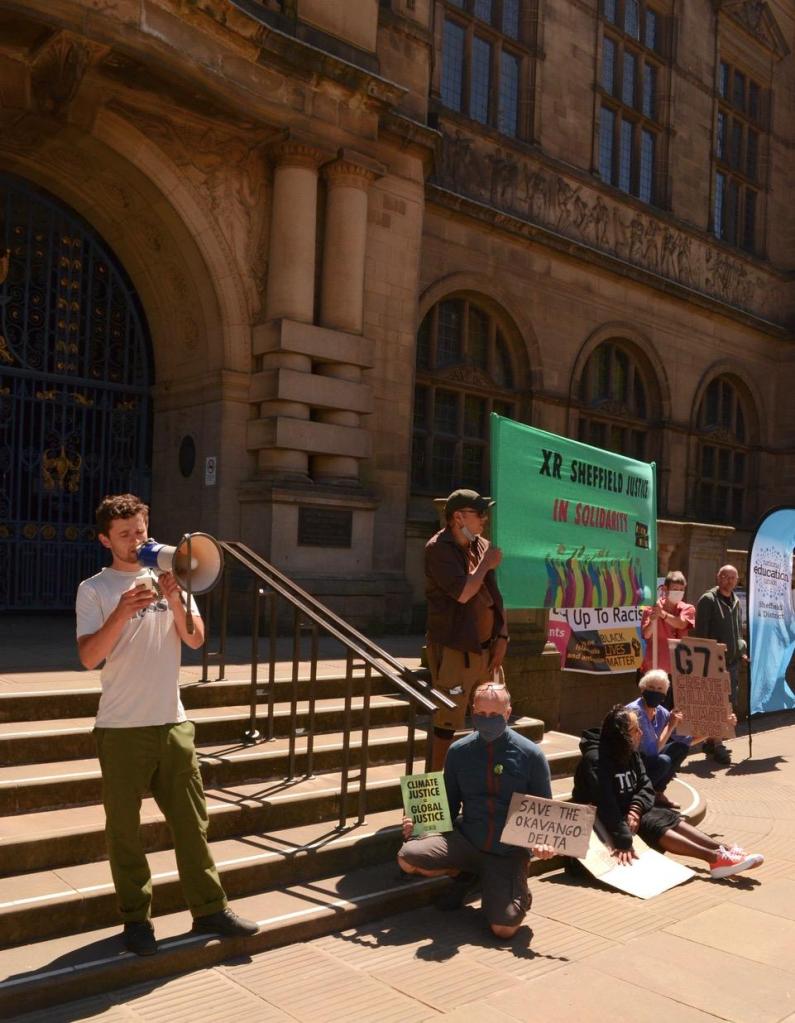 Many different groups joined together in Sheffield City Centre to send a clear message to the G7 leaders meeting in Cornwall and those preparing to go to COP in Glasgow in November. ACT NOW! I was particularly pleased to hear the Extinction Rebellion Justice Group “pass the mic” to the global south, by reading messages from XR campaigners in Namibia and India. Here are the speeches, in no particular order.