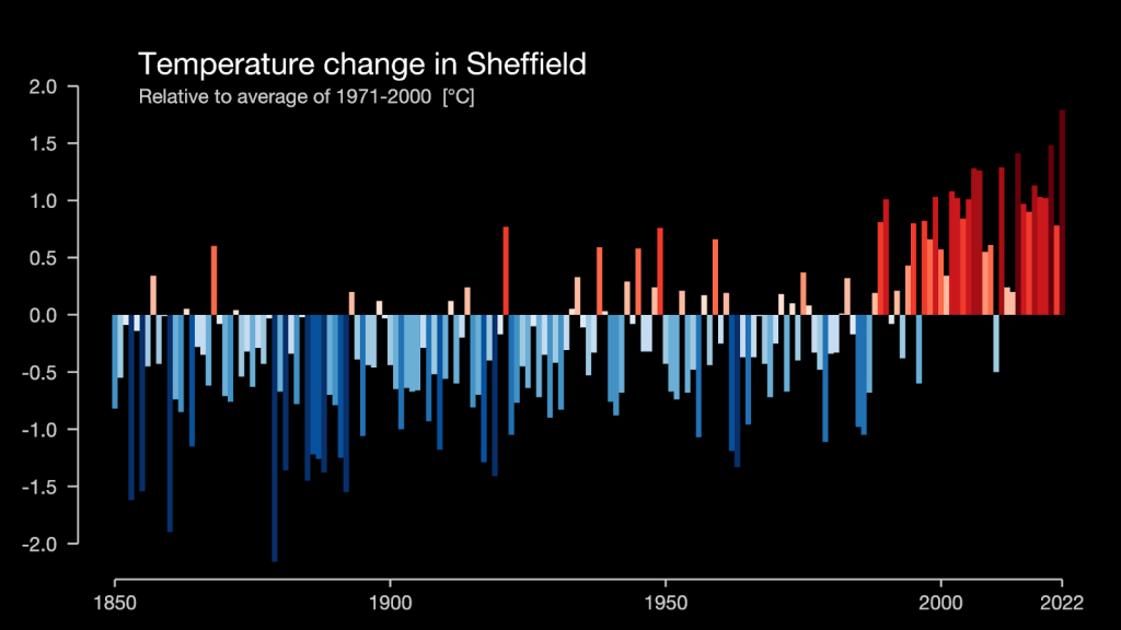 This graph was generated from the “Show your Stripes” website, which is run by the Institute of Environmental Analytics at Reading University. The graph compares each year’s temperature in Sheffield with the average for the years between 1971 and 2000. Last year was the hottest year on record and the previous hottest was 2020. We are now regularly experiencing temperatures more than 1 degree above this average.