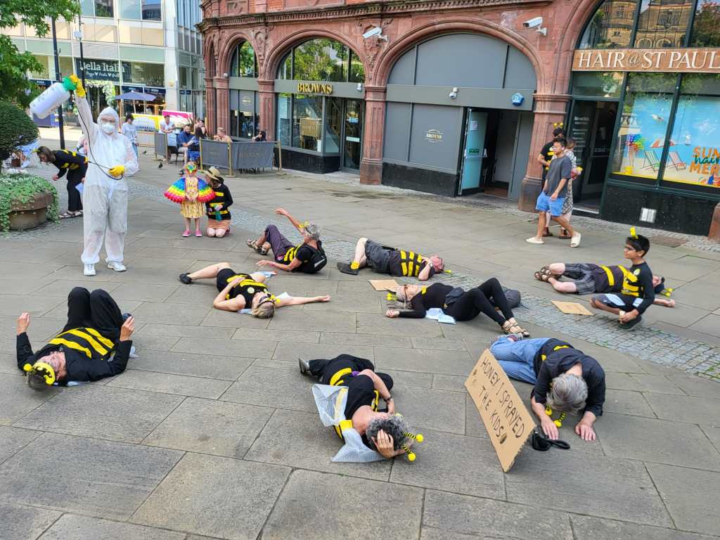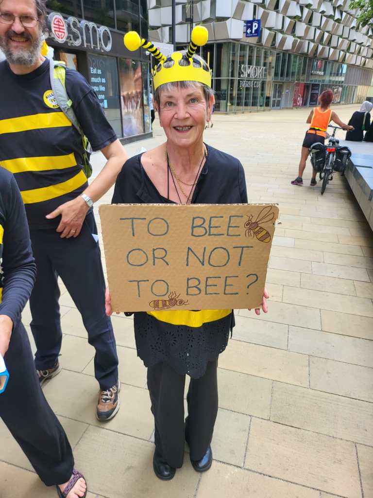 On Saturday, September 9th members of Sheffield Extinction Rebellion dressed as bees and visited the Winter Gardens, Peace Gardens and Sheffield Town Hall. The Queen Bee, Her Royal Honeyness Queen Beeatrice, made a moving speech that was translated into English by the Bee Whizzperer.
