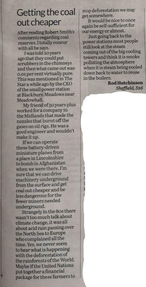 Rod Hutchinson’s letter advocating more coal mines (Star 10/10/23 see below) is at best wrong and at worst dangerously misleading.