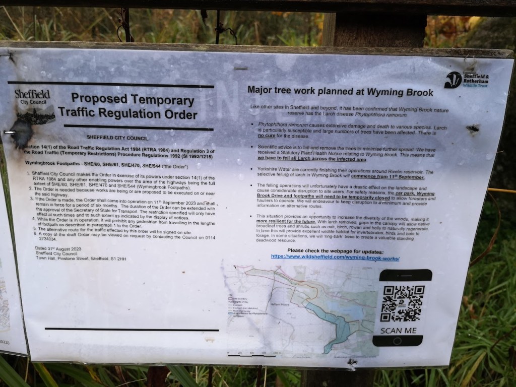 One of my original questions was “Why does the SRWT website say this is “Major Works at Wyming Brook to remove diseased trees” when the vast majority of the trees are healthy?” (I now realise only 6 trees were sampled and all were found to be diseased. I wonder what the probability is that all the larch trees are diseased? One would hope there might be some trees that are resistant to the water mould. )