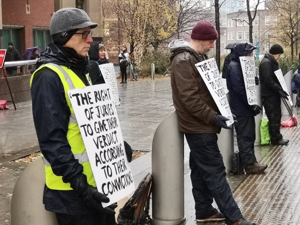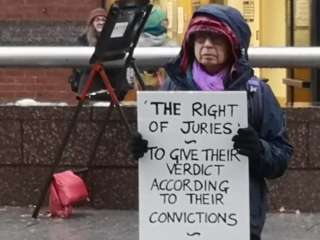 There are strong indications that united, collective action to defend the principle of jury equity is proving effective. Just days after the Solicitor General’s announcement to prosecute Warner, 252 people gathered outside 25 crown courts across England and Wales, holding similar signs in solidarity with Trudi Warner. None were arrested and there has been no indication of a police investigation since then. An investigation into people previously arrested for displaying posters with the same message has now been discontinued.