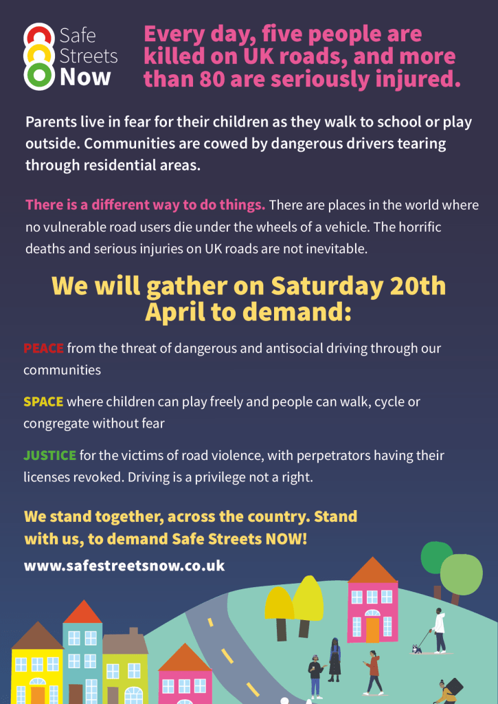 On Saturday April 20th from 11am to 12 noon there will be two simultaneous Safe Streets Now actions in Sheffield at Walkley and Park Hill.