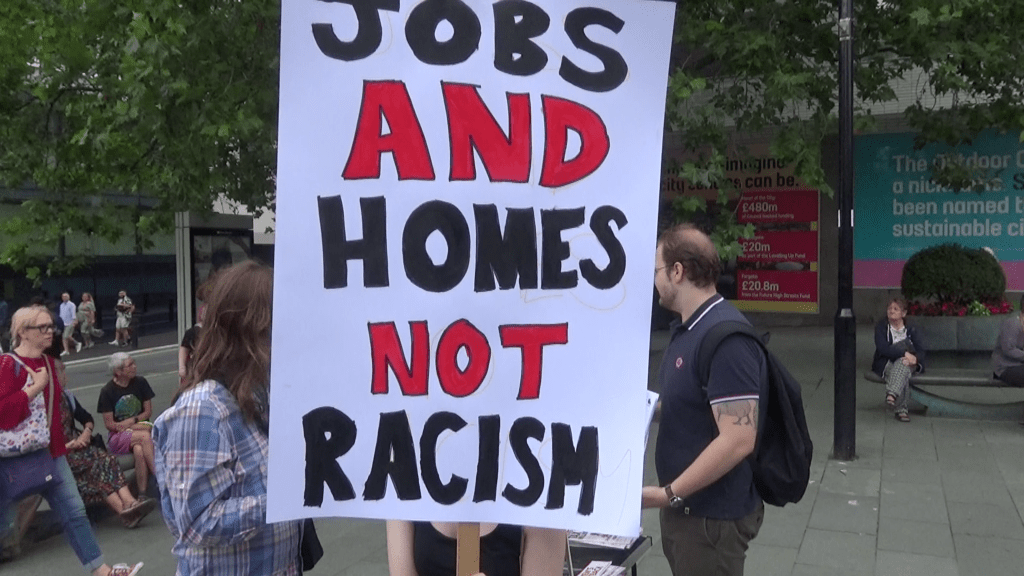 Sam Moorcroft from the Trades Council gave a thundering speech calling the attempt to burn down the hotel in Rotherham “a shameful violent act by shameful violent people.”