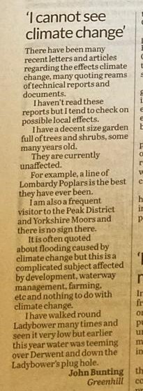 John Bunting (Sheffield Telegraph 01/08/24) hasn’t noticed the effects of climate change in his garden or in the Peak District. He should count himself lucky, as many people in the global south have experienced drought, storms and flooding making it increasingly difficult to survive.