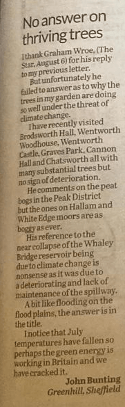 He is a bit like a patient in a hospital, who looks at his toe and says “I can’t be ill, my toe is fine” while at the same time ignoring the scan showing the dangerous cancer growth inside him. Just because you haven’t noticed climate change in your garden John it does not mean it is not happening. The people living in Athens certainly have noticed this week with wildfires burning down houses and destroying communities.