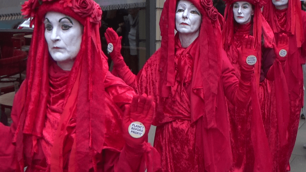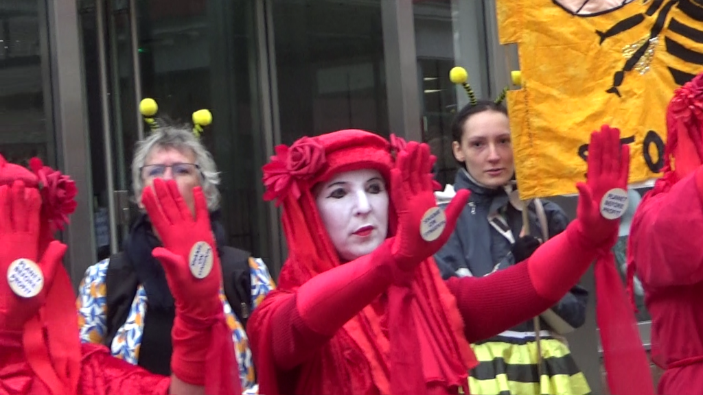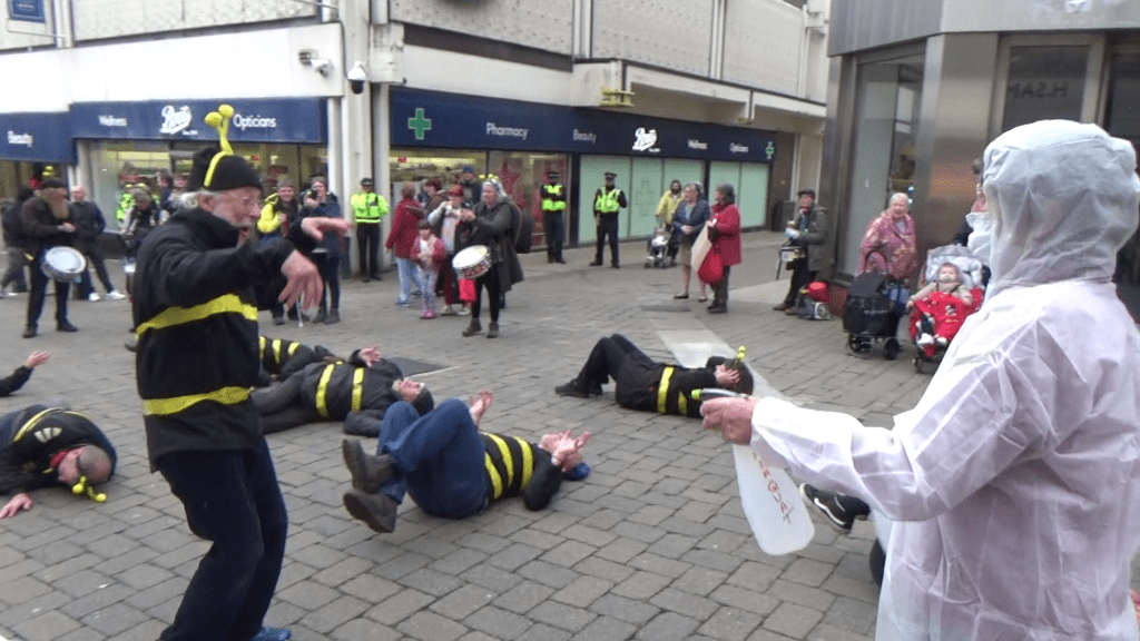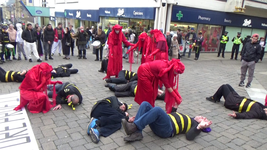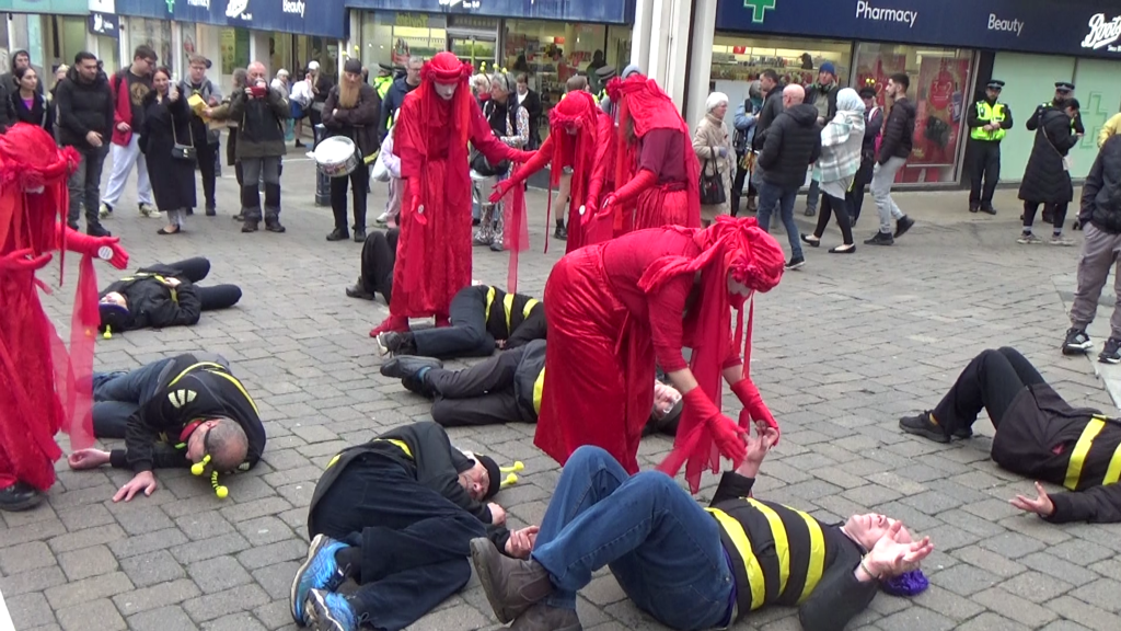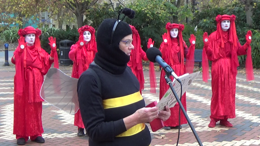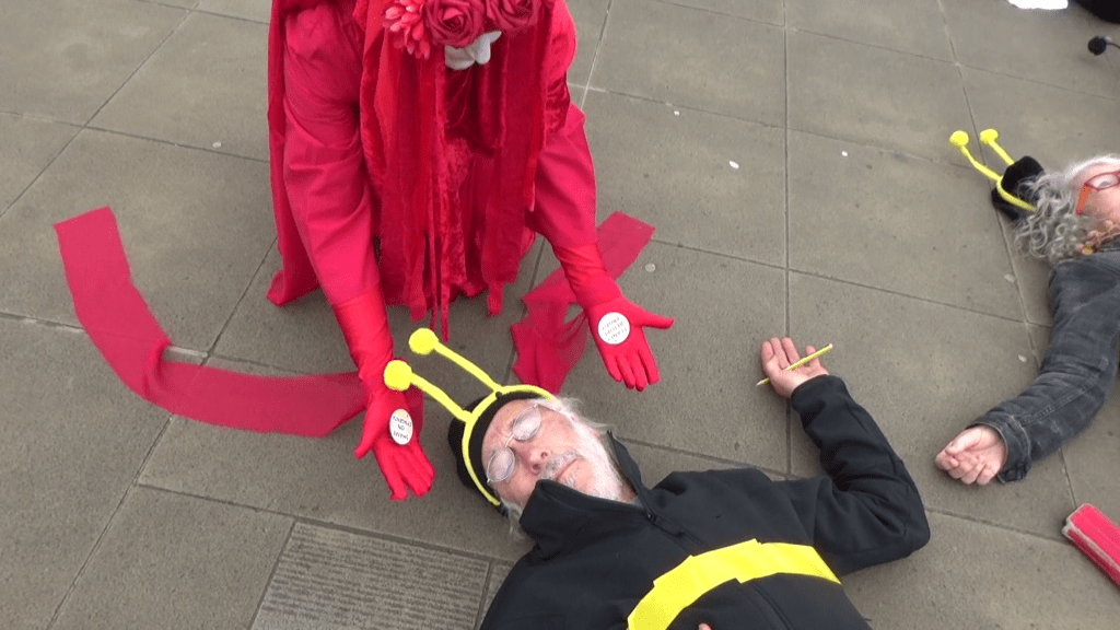 The event included drumming and singing, a bee die-in, an appearance from Extinction Rebellion’s Red Rebels, who came to mourn the bees, and leafleting of the public.