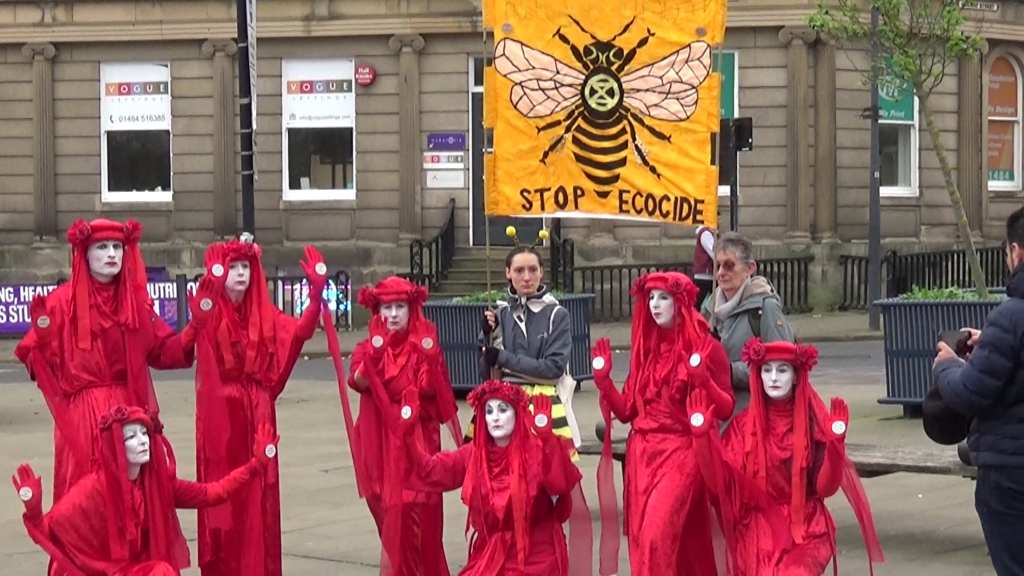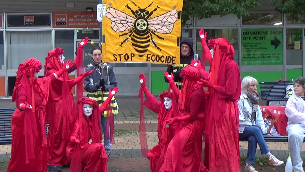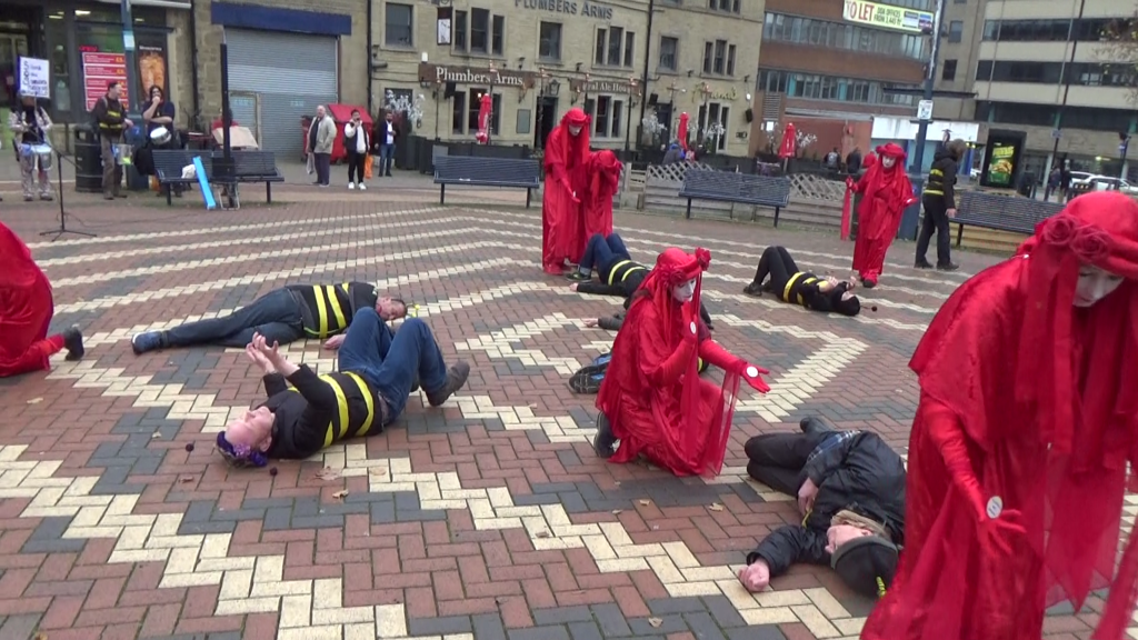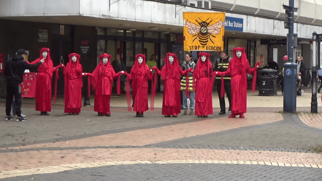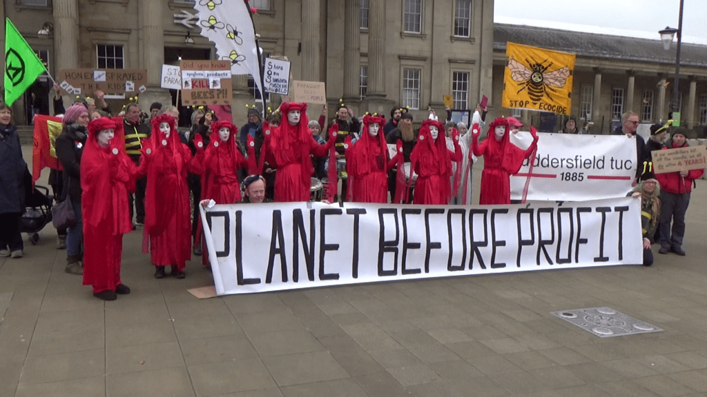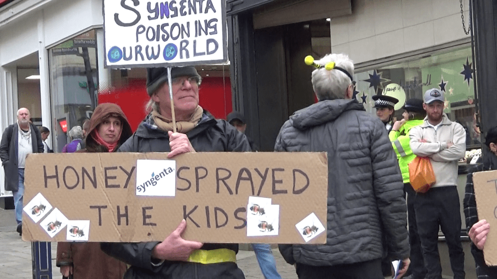 Activists from Extinction Rebellion, Friends of the Earth and other groups around the North of England, many from Sheffield, gathered in Huddersfield on Saturday, November 9th, to raise awareness about Syngenta’s shameful operations. The company exports dangerous pesticides banned for use in this country to other countries worldwide.