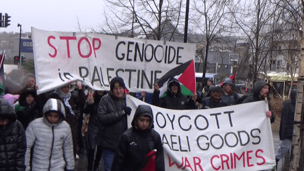 As Storm Darragh pounded Sheffield on Saturday, resilient protesters turned up once again to demand an end to the Genocide in Gaza. The first stop was Tesco, where the Tadhamon Singers went inside to perform to the shoppers, persuading them to join the boycott of Israeli goods. This is what happened.