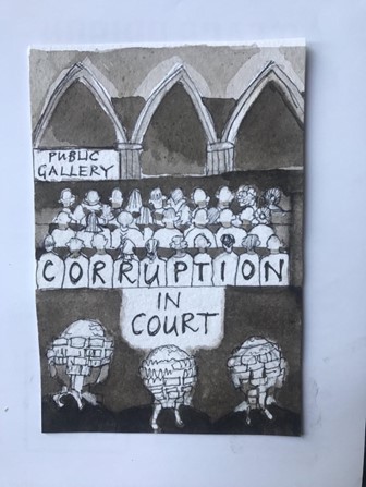 As the judgement was announced, over 30 members of the public gallery calmly and silently stood up, turned their backs to the judges and removed their outer garments to reveal t-shirts with the message “Corruption In Court” emblazoned upon their backs (artist’s impression above) . This was in protest against the public scandal of undue corporate influence by arms and oil companies upon our legal system as a whole and the recent spate of excessively hefty prison sentences for peaceful protest in particular.