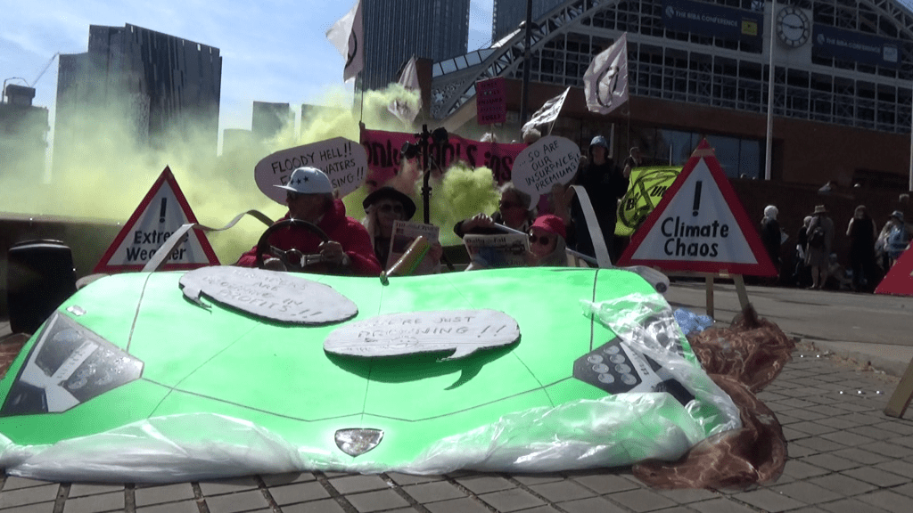 The creative disruption began with the arrival of a life-sized model of a “Shamborghini” sports car, made to look as though it was sinking in flood waters to highlight the danger of extreme weather events caused by the climate crisis. The car was converted into a James Corden-style Karaoke booth where activists sang songs like “Why does it always rain on me?”