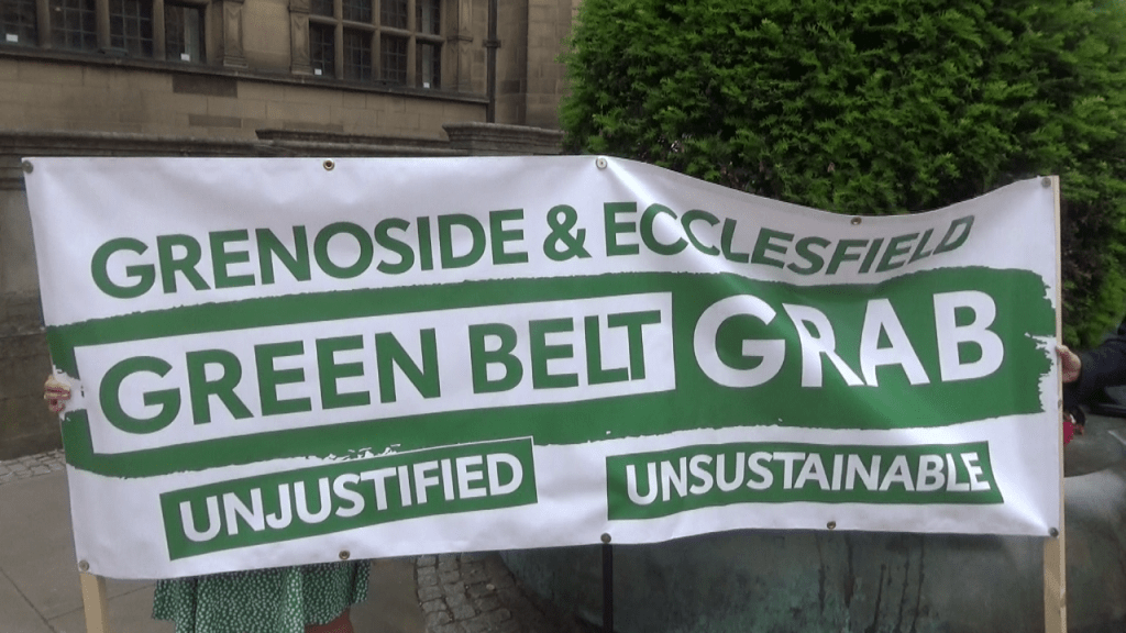 Jo Tunstall said “I’m here to protest today on behalf of the Save Our Green Belt Chapeltown, Ecclesfield and Grenoside campaign. So within S35 there are 14 parcels of Greenbelt land that have been allocated for housing and employment land. Of those 14 parcels there’s nine of them that have been allocated within S35. The land there certainly the the areas that have been chosen are some of the highest scoring green belt. So they stop urban sprawl out to the countryside and they also stop localities merging. So, localities like Foxhill, Parson Cross, Chapeltown, Ecclesfield, and Grenoside, but also because we live on the north side of Sheffield, those green belts also help separate us from Barnsley and Rotherham. So from a scoring perspective they are some of the highest scoring green belts. Two of the sites contain ancient woodland and those sites have been proposed for massive logistics buildings which obviously are going to have a significant detrimental effect. If you’re putting up a massive great logistics building to ancient woodland, then obviously there will be irreparable damage to that woodland. One housing site for 609 houses is actually a working farm at the moment. It’s a Sheffield City Council-owned piece of land that has a tenant farmer that’s been there for 44 years. They’re a first generation and they have a lease for three generations. They’re effectively going to lose their business and their home to provide 609 houses on that Green Belt land. We don’t want any building on Greenbelt. There’s absolutely no need for it. We have more than enough brownfield sites across Sheffield. We basically believe that the council have just done a lazy job in planning. They’ve tried to hit the numbers by going in areas that developers want to hit big numbers by way of housing and it’s not sustainable development.