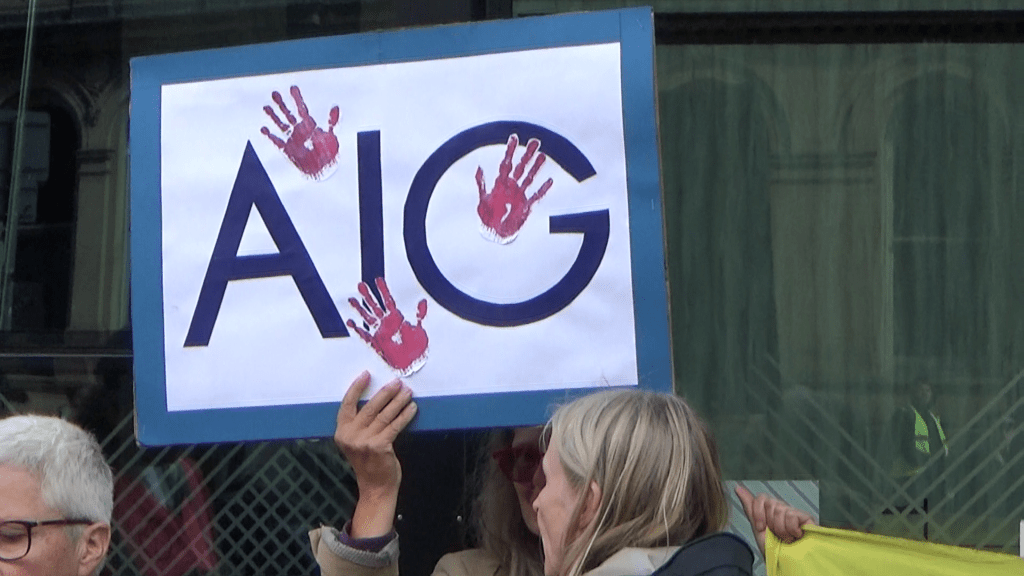 “A.I.G. in the U.S. is a leading provider to everyday people of car, house, pet and life insurance. Keeping them safe, so they say. Meanwhile, AIG quietly insures 4 major arms companies which supply Israel with weapons. Weapons used on Palestinians, to destroy houses, cars, pets and lives.