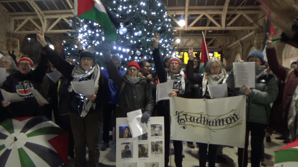 On Friday a flash mob of campaigners for Palestine took over the concourse of Sheffield Station, singing Carols with new words for Palestine, led by the Tadhamon Singers.