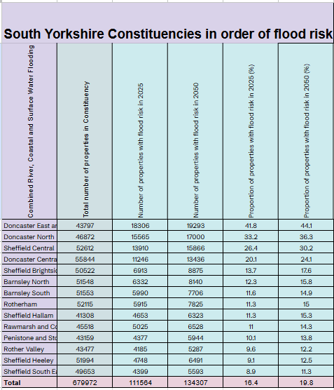 *The best constituencies to avoid floods locally are Sheffield South East and Sheffield Heeley. Doncaster East, Doncaster North and Sheffield Central have the most threatened properties in South Yorkshire.