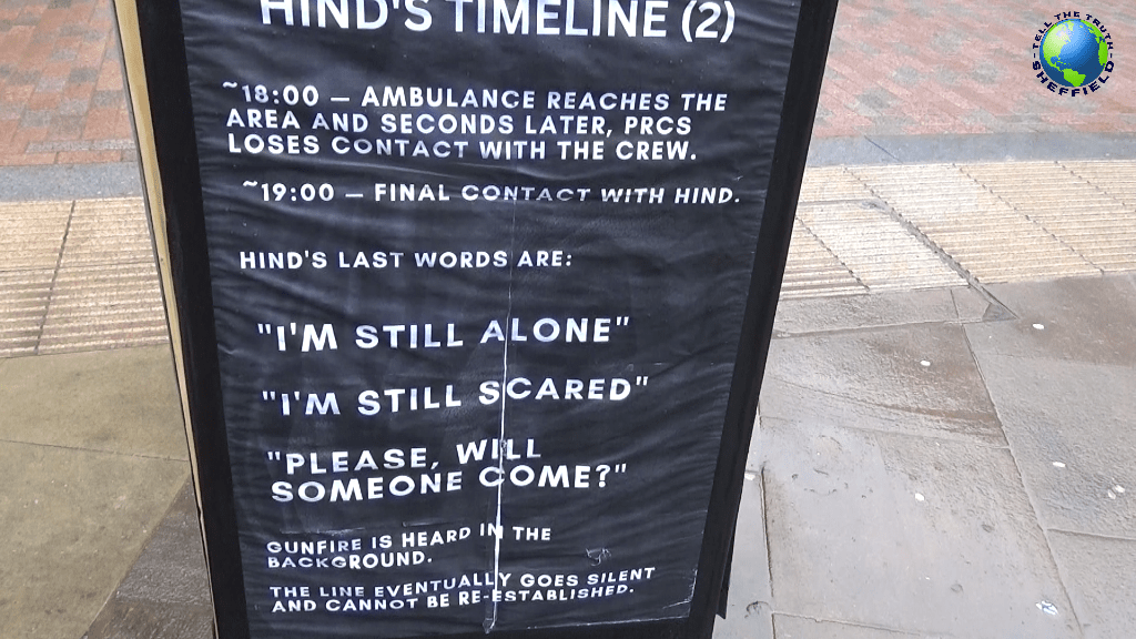 We’re really pleased to welcome this Hind Rajab exhibit to Sheffield. It’s been touring cities across England, and it’s fantastic that it’s come here to Sheffield to support our work for justice for Palestine. The story of Hind is very well known. A little girl is trying to flee to safety with six members of her family from the Israeli bombardment of Gaza City. But then her car was attacked, and all the relatives inside were killed, leaving just Hind alive. She had a telephone, and she placed a desperate call for assistance. And many hours later, many hours later, the rescuers were given the permission which they had to seek from the Israeli army to go to rescue her, and an ambulance went with two paramedics inside. A desperate call was placed by Hind, who was the last person alive in the car to get rescue and help. And the people in the office in Ramula had to contact the Israeli army, and it took them many hours to get a green light, a safe route for the ambulance crew. But when the ambulance crew arrived, they too were bombed and killed, and Hind was probably the last person surviving. 300-plus bullets were riddling her car. The story is terrible, and we’re proud to represent that story in Sheffield. But one point that’s really important that we want to make is that Hind is just one of the children of Palestine, one of the children of Gaza. her family are just among the many thousands, tens of thousands who’ve been slaughtered in this genocide. And what our exhibition and our leaflet try to point out is that Hind is a representative. She’s a voice. She’s an example of what’s going on across Palestine from the river to the sea. And we think that people who are captured by her story, hopefully, will progress to look at the story of Palestine in its entire history of 70-odd years of settler colonialism.”