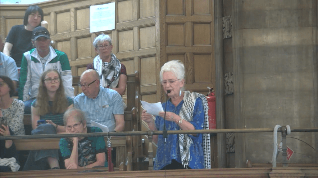 Here is Sheffield Green Councillor Alexi Dimond pushing the Labour Council leader Tom Hunt to support Boycott, Divestment and Sanctions against Israel at the end of last year.