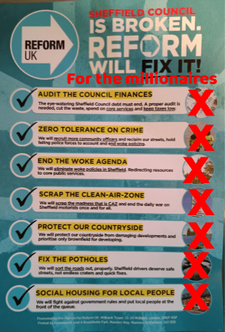Reform says they will “End Woke policies in Sheffield”. But they don’t say what these “woke” policies are! I believe they mean ending diversity and climate change training for Councillors and staff, and stopping pension fund managers investing in low-carbon initiatives. I believe they want to discriminate against minorities such as trans and gay people and people of colour, and hate anything that prevents that. The amount of money spent on such training is tiny anyway.