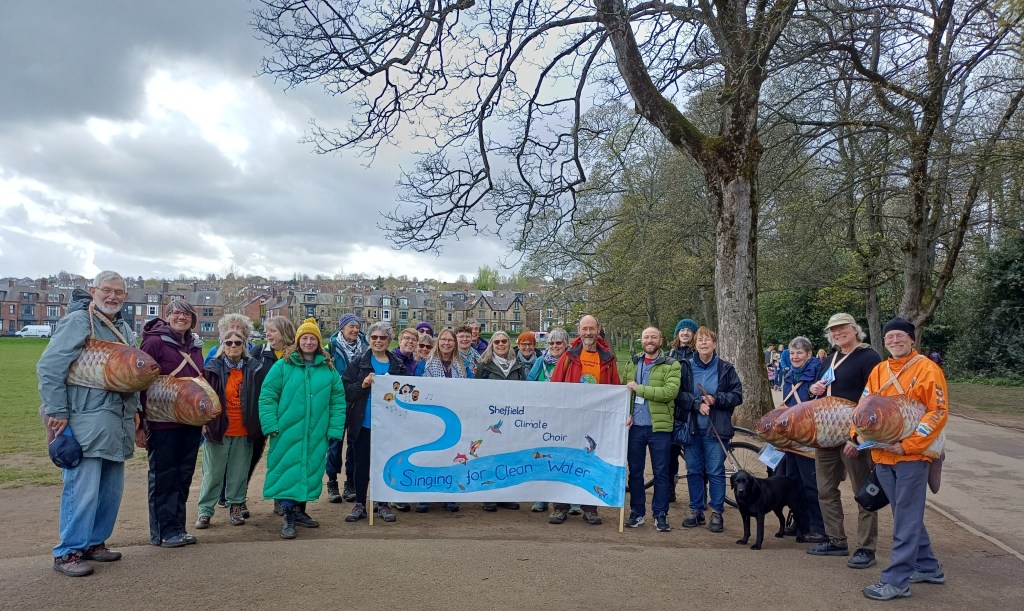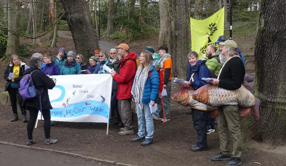 On Sunday, 12th April, about 20 members of Sheffield Climate Choir walked out through Endcliffe Park, following the course of the Porter Brook, for a singing river walk. The group were concerned about the frequent sewage dumps from Yorkshire Water into our rivers and streams. Undaunted by the occasional April shower, the group walked the length of the park, stopping in strategic spots to sing songs warning of water pollution. They were supported by members of Extinction Rebellion Sheffield, sporting very fetching fish costumes, who handed out leaflets and engaged with passers-by. The leaflets listed things that people could do for cleaner water, including joining the Sheaf and Porter Rivers Trust, https://www.sheafportertrust.org/ and joining the Great UK Water Blitz. https://earthwatch.org.uk/greatukwaterblitz/