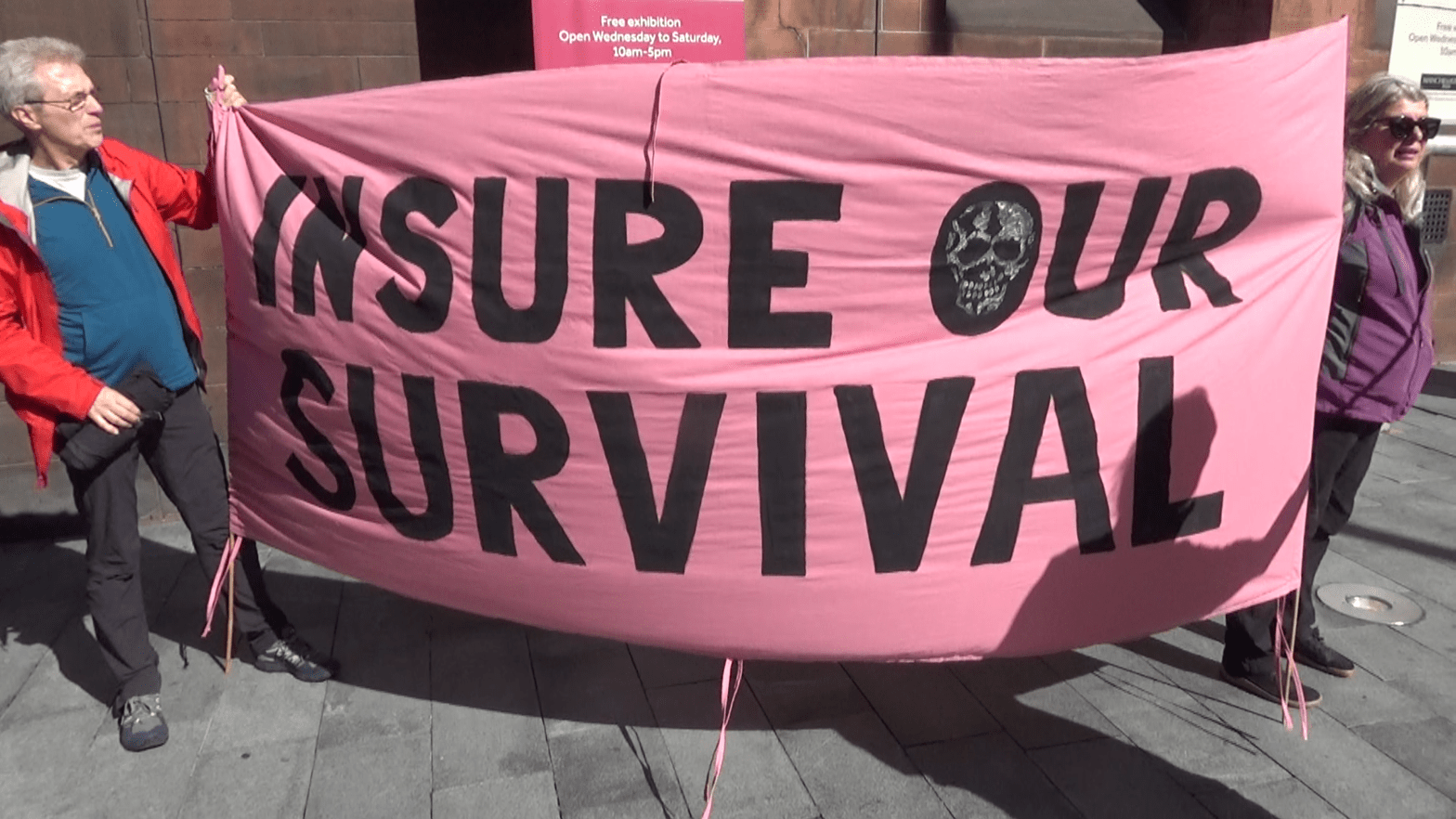 by Graham Wroe Changing your insurance company could help in the battle to stop the climate catastrophe and end the genocide in Gaza. Want to know how? Then read on! https://youtu.be/qNJ646BqVng Damage caused by flooding and storms has seen the biggest rise in insurance claims in the past 10 years. Global insured losses from naturalContinueContinue reading “Sheffield Activists help blockade AXA and AIG in Manchester as part of global Insure Our Survival protests.”